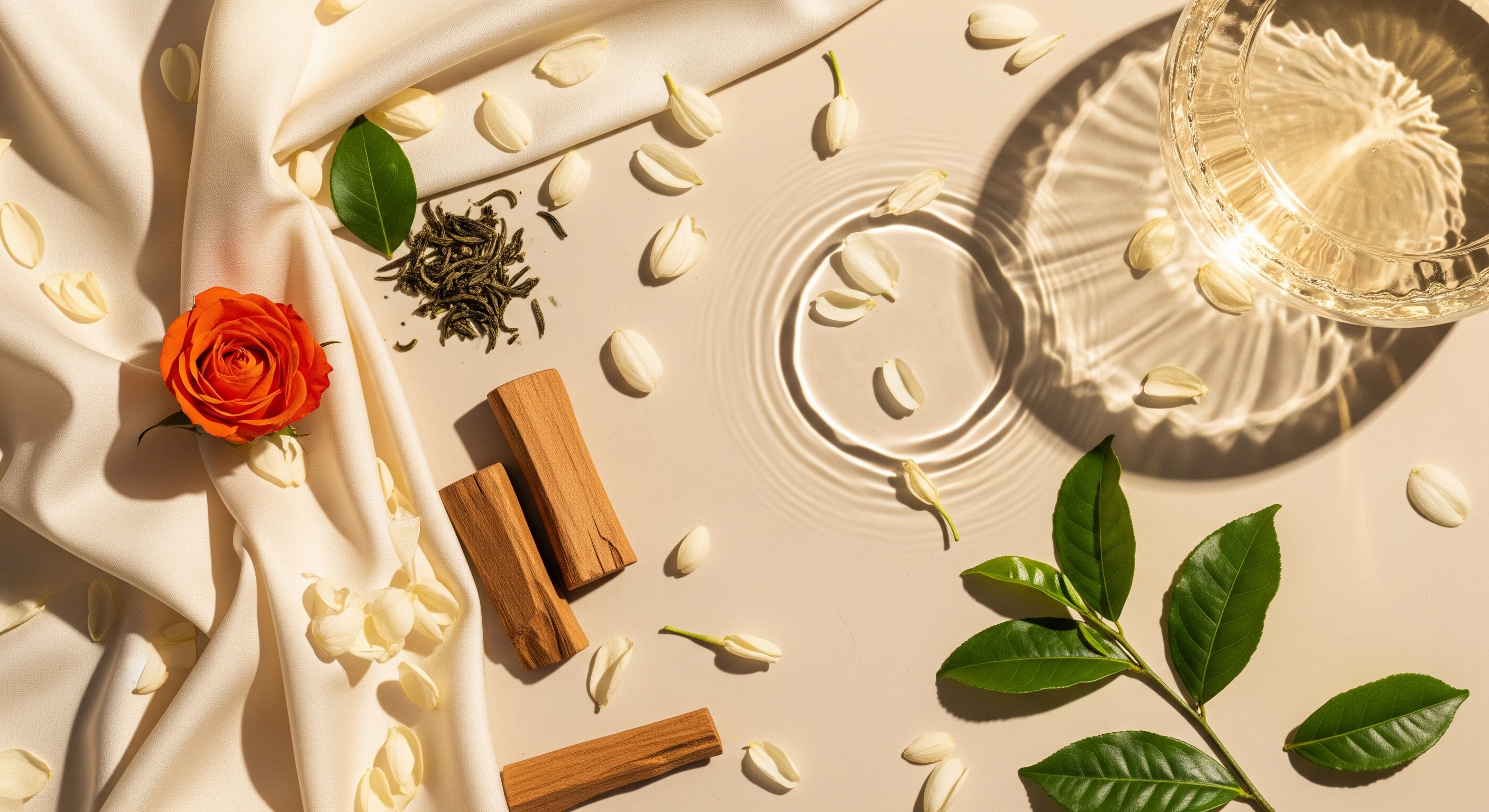Potent Ayurvedic extracts & floral water — Turmeric, Ashwagandha, Pomegranate, Rose — revered for centuries to brighten, calm, and revive skin from within.